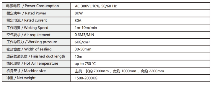 用于生產負壓通風管道,管道直徑為300mm~1000mm。最大成品長度約10M。成品可應用于礦山、隧道等需要負壓通風的場所。設備可實現自動輸送膠帶和鋼絲,熱風焊接,鋼絲螺距定距等功能。